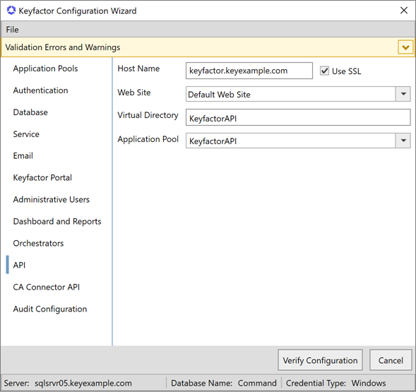 The Keyfactor CA Connector is installed in the customer environment to provide a connection between a CA and Keyfactor Command when a direct connection is not possible. It is supported on both Windows and Linux and has versions for Microsoft (Windows only) or EJBCA CAs. API tab, enter the FQDN of the server hosting the Keyfactor Command CA Connector API service in the Host Name field. This can be either the actual host name of the server on which you are installing the CA Connector API component or a DNS alias pointing to the server. Select the Default Web Site in the Web Site dropdown, or other web site as desired. Accept the default for the Virtual Directory and select the application pool for this virtual directory that you created earlier in the Application Pool dropdown. Check or uncheck the Use SSL box as appropriate for your environment.