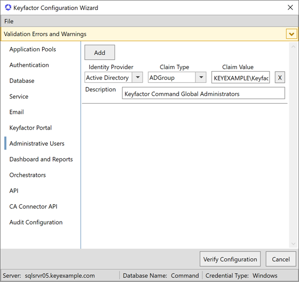 On the Administrative Users tab, click Add to add users or groups that you will use to control administrative access to the Keyfactor Command Management Portal.