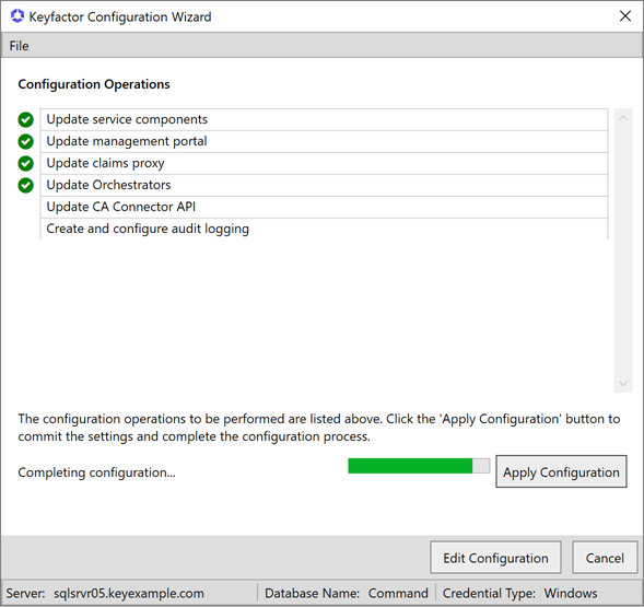- The selected database is empty and not associated with Keyfactor Command; it will be populated with the Keyfactor Command schema.