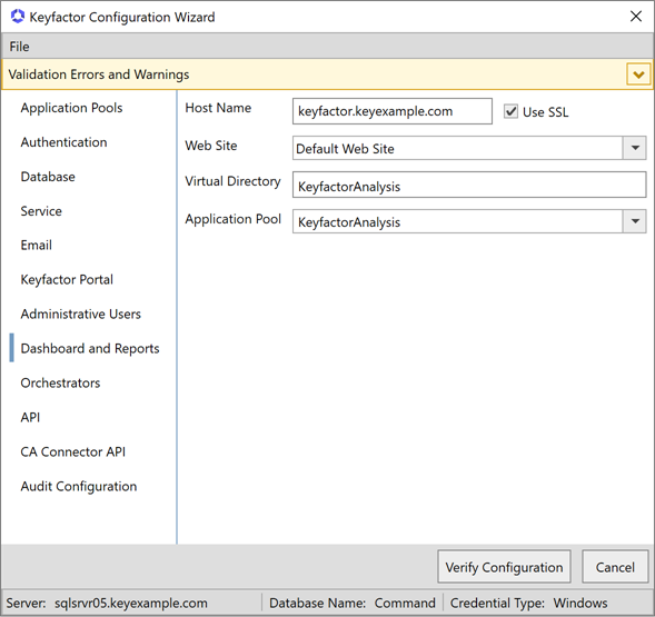 On the Dashboard and Reports tab, enter the FQDN of the server hosting the Keyfactor CommandManagement Portal—where the Logi Analytics Platform is installed—in the Host Name field. This can be either the actual host name of the server on which you are installing the Keyfactor CommandManagement Portal component or a DNS alias pointing to the server. Check or uncheck the Use SSL box as appropriate for your environment. Select the Default Web Site in the Web Site dropdown, or other web site as desired. Accept the default for the Virtual Directory and select the application pool for this virtual directory that you created earlier in the Application Pool dropdown.