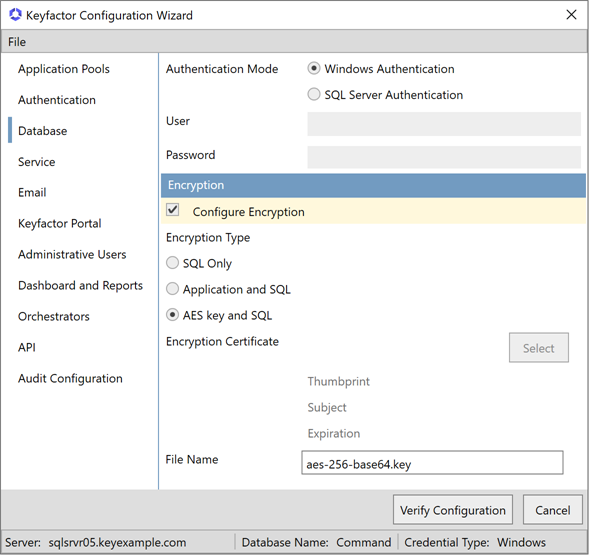 AES key and SQL: Application-level encryption is done using a base-64 encoded raw AES key stored in a file on the Keyfactor Command server(s). This methods is most commonly used when migrating a Keyfactor Command installation on Windows to a Keyfactor Command installation in containers under Kubernetes.