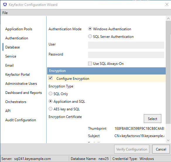 The Configure Encryption option enables the encryption of select sensitive data stored in the database using a separate encryption methodology. This layer of encryption, applied on top of the standard Microsoft SQL Server encryption, uses a certificate or AES key to further protect data. This additional security layer ensures the protection of sensitive information in scenarios where SQL Server master keys cannot be adequately secured.