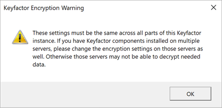 Check the Configure Encryption box. Read and understand the encryption warning. This warning applies to implementations with more than one Keyfactor Command server.