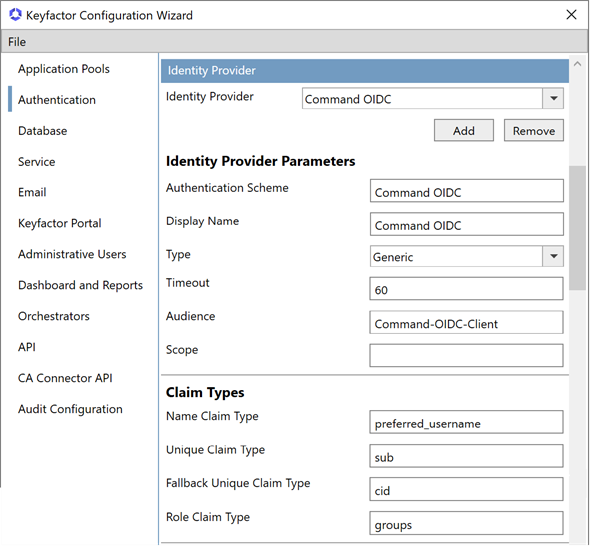 One or more scopes that are requested during the OIDC protocol when Keyfactor Command is the relying party. Multiple scopes should be separated by spaces. This value is not typically used for Keycloak. |
