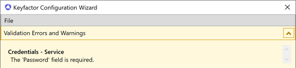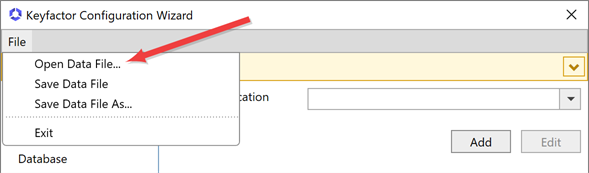 In the Keyfactor Command configuration wizard, you can choose to upload a configuration file to populate the fields. You may have a file saved from a previous run of the configuration wizard or you may be provided one by Keyfactor. To upload a file, in the configuration wizard, click File at the top of the wizard and choose Open Data File. Browse to locate the configuration file. Configuration files have an extension of .cmscfg. The file may be protected with a password. If it is, you will need to provide this password to open the file. Continue with the remainder of the steps, reviewing the tabs to assure that the data is complete and correct.