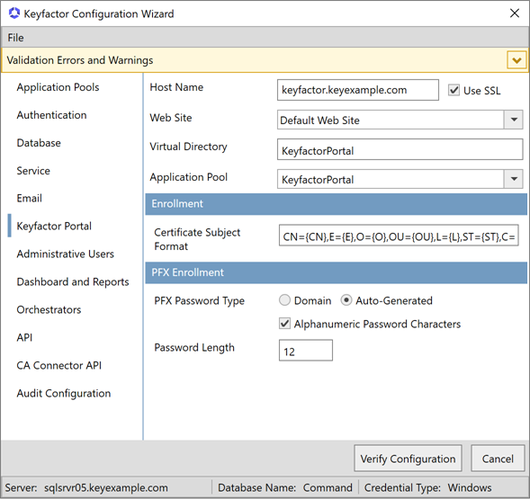 On the Keyfactor Portal tab in the top section, enter the FQDN that you will use to access the Keyfactor Command Management Portal in the Host Name field. This can be either the actual host name of the server on which you are installing the Keyfactor Command Administration component or a DNS alias pointing to the server. If you have multiple Keyfactor Command Management Portal servers with load balancing, this will be a DNS name pointing to your load balancer. Select the Default Web Site in the Web Site dropdown, or other web site as desired. Accept the default for the Virtual Directory and select the application pool for this virtual directory that you created earlier in the Application Pool dropdown. Check or uncheck the Use SSL box as appropriate for your environment.