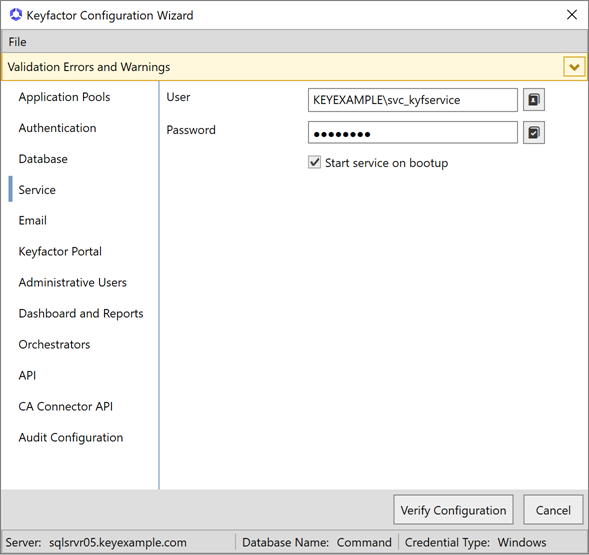 ) to confirm that the username and password entered are valid. If desired, check the Start service on bootup box to start the Keyfactor Command Service at system start.