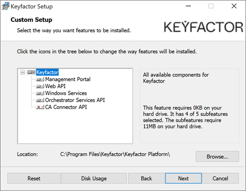 C:\Program Files\Keyfactor\Keyfactor Platform\Note: Although Figure 559: Install: Select Components shows only the default components selected, the remainder of this page covers configuring Keyfactor Command as though all the components have been selected.
