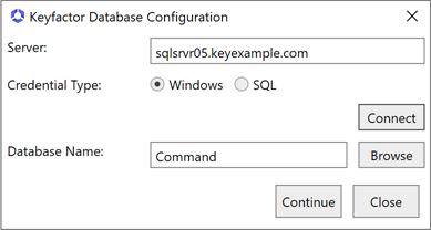 On the Keyfactor Command Database Configuration page, enter the name, IP address, or fully qualified domain name (FQDN) of your SQL server and select a Credential Type of either Windows or SQL.