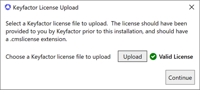 On the Keyfactor Command License upload page, click Upload and browse to locate the license file provided to you by Keyfactor. This file should have the extension CMSLICENSE. Once the uploaded license shows as valid, click Continue.