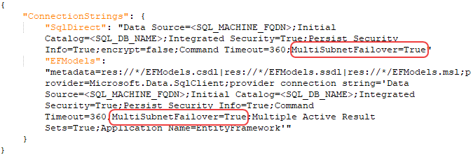 Figure 542: SQL Connection Strings with MultiSubnetFailover Option Enabled n a Windows Install SqlConnectionStrings.json File