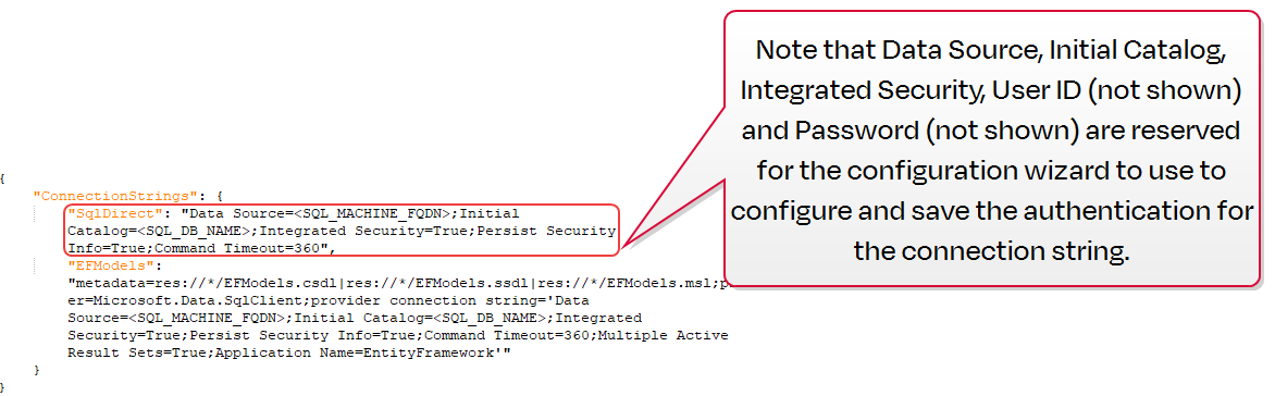 To create a customized connection string template, after installing the Keyfactor Command software but before running the configuration wizard, modify both the EFModels and SqlDirect connection strings in the SqlConnectionStrings.json file found in theConfiguration folder under your installation directory. By default, this is: