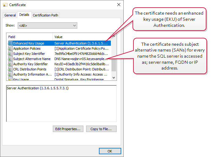 Enroll for the certificate using your preferred method, being sure to give the certificate a CN (it will not appear in the configuration tool without this) and add subject alternative names (SANs) to it for all the IP addresses, server names, and FQDNs that you might use to reference the SQL server when communicating with it, including DNS
