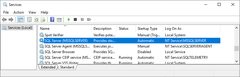 - On the SQL server open the Services.msc MMC and scroll down to locate the SQL Server ([YOUR INSTANCE NAME]) service.