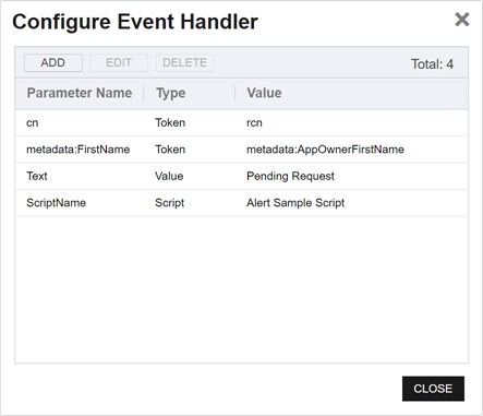 Click the Configure button in the Use handler section of the page to open the Configure Event Handler dialog and then click Add.