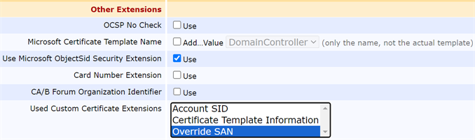 Scroll down to locate the Other Extensions: Used Custom Certificate Extensions section and select the custom certificate extension you created in the previous step. This is needed both to support enrolling with large SANs and for custom SANs.