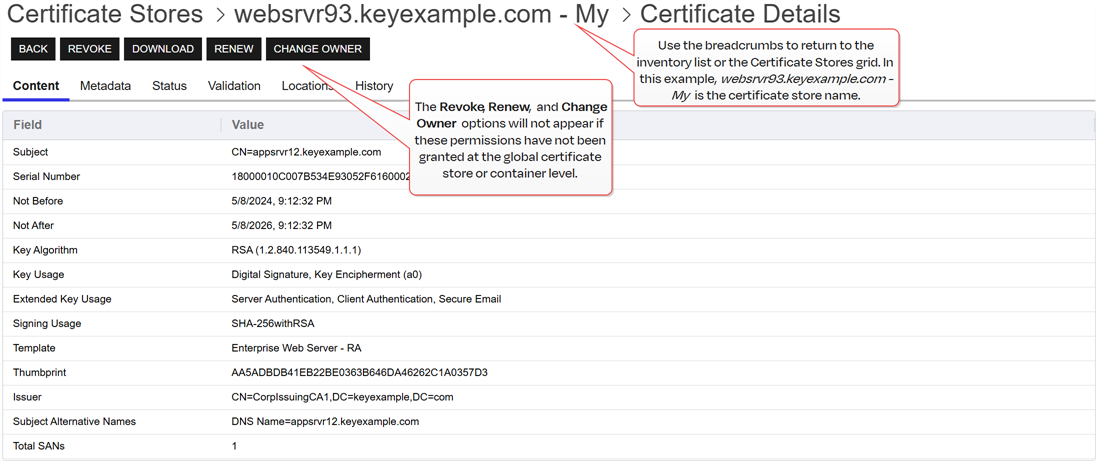Depending on the permissions granted globally to certificate stores or the container associated with the selected certificate store, one or more of the following options may be available on the certificate details page: