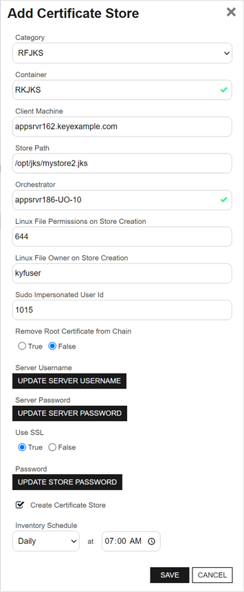 The dialog may present additional fields depending on the configuration of the Custom Fields for the certificate store type. Some additional fields that you may find for common Keyfactor custom-built extensions include:
