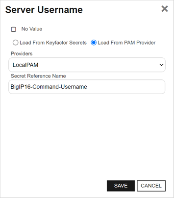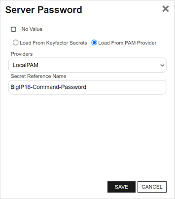 Load From PAM Provider. The No Value option is typically not supported for server authentication.This field only appears if your custom certificate store type indicates that it Needs Server.