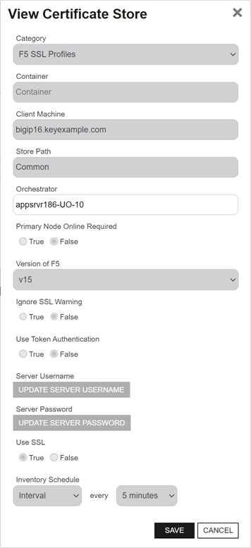 - For F5 certificate stores, in the Use Token Authentication field, either accept the default of false, to use basic authentication for all communications with the F5 device, or true, to use basic authentication for the initial connection to the F5 device to acquire an authentication token which will be used for all subsequent API requests.