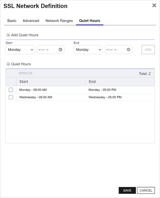 In the SSL Network Definition dialog on the Quiet Hours tab, define quiet hour periods as follows: