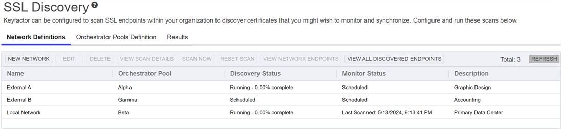- On the Network Definitions tab, highlight the row in the SSL network grid of the network to scan and click Scan Now at the top of the grid or right-click the network in the grid and choose Scan Now from the right-click menu. The scan will begin immediately.