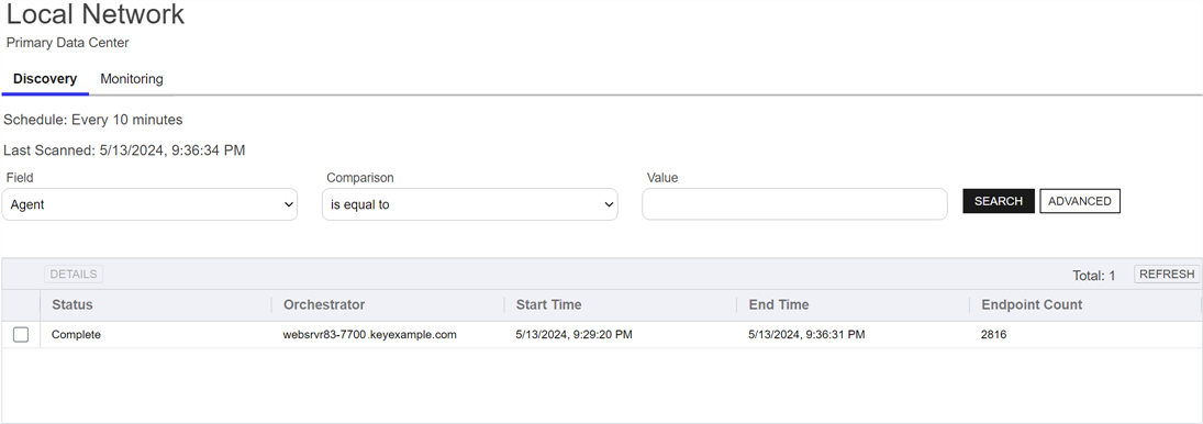This takes you to a separate page with separate tabs for Discovery and Monitoring jobs (see Figure 330: SSL Network Scan Details Page). Details for the last scanned job display above the grid in each tab and the scanned segments for the latest scan populate the grid. You will only see more than one row in the grid if the SSL management job was broken into segments due to having a large number of endpoints. The number of endpoints per segment is configurable (see the SSL Maximum Scan Job Size setting in Application Settings: Agents Tab). The grid will display the latest completed job and will be refreshed with new scan details when the next scan begins.