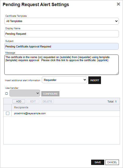 Pending certificate request alerts are designed to send an email notification to certificate approvers when a certificate request is received that requires approval based on policy on the CAClosed A certificate authority (CA) is an entity that issues digital certificates. Within Keyfactor Command, a CA may be a Microsoft CA or a Keyfactor gateway to a cloud-based or remote CA.. Pending request alerts can also be sent to the original certificate requesters alerting them that their certificate requests have been sent.