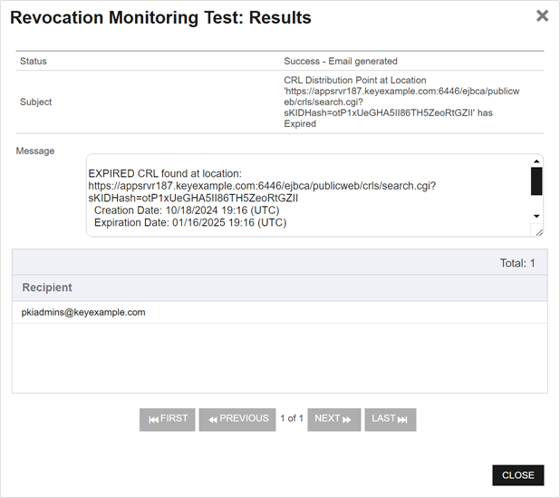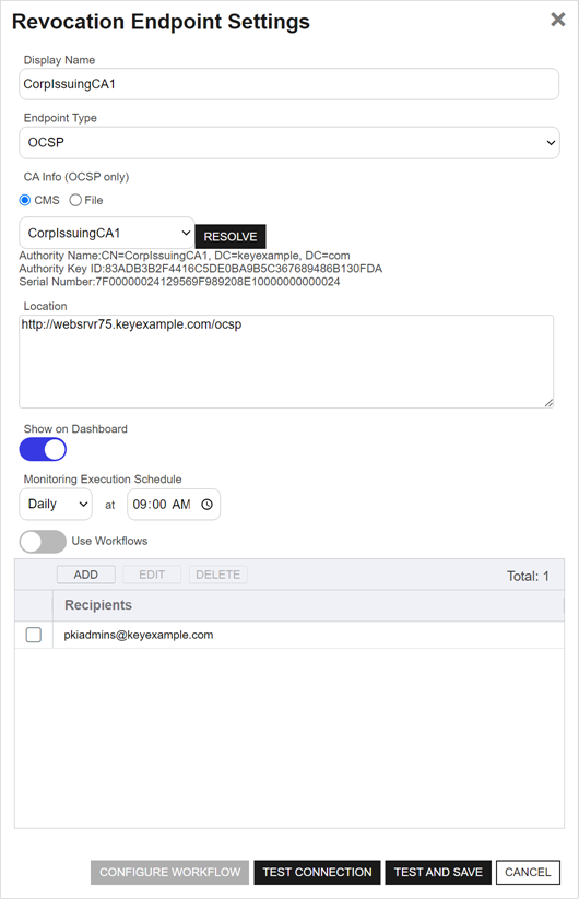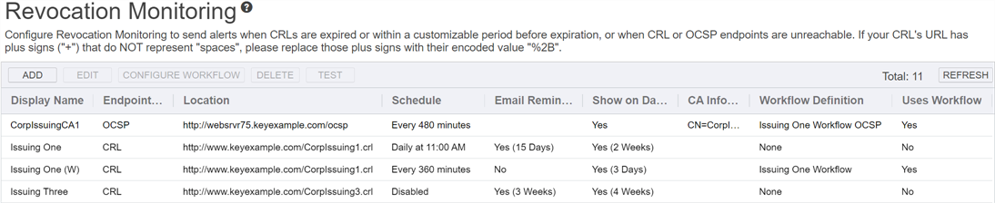 From the Revocation Monitoring page on the Keyfactor Command Management Portal you can view and edit existing location endpoints, add new locations, delete an endpointClosed An endpoint is a URL that enables the API to gain access to resources on a server., test revocation monitoring location alert email notifications, and monitor location endpoint responsiveness.