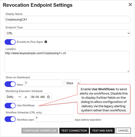 Note:  Revocation monitoring supports using either the legacy alerting system to deliver alerts or the newer workflowClosed A workflow is a series of steps necessary to complete a process. In Keyfactor Command, it refers to the workflow builder, which allows you to automate event-driven tasks such as when a certificate is requested, revoked or found in a certificate store. system. The workflow system offers more options for injecting actions in the process than the legacy alerting system. To configure an alert to use the workflow system for alerting, toggle Use Workflows to enable the option and create a workflow for the alert (see details below).