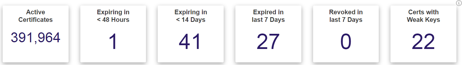 The legacy dashboard provides you with a quick glance at the status of your PKIClosed A public key infrastructure (PKI) is a set of roles, policies, and procedures needed to create, manage, distribute, use, store and revoke digital certificates and manage public-key encryption.. It is a global representation of your PKI and does not filter data based on your access.