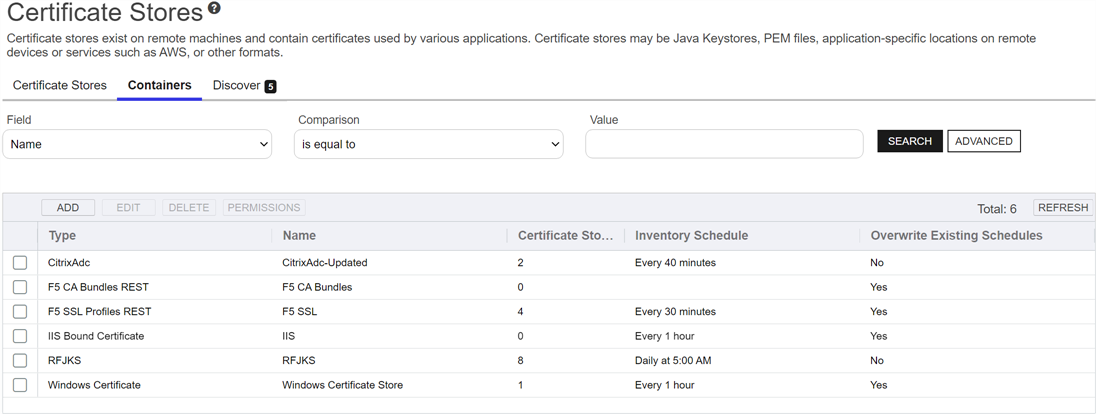 Certificate store container operations include creating or editing containers—including scheduling inventory for the container—and deleting containers.