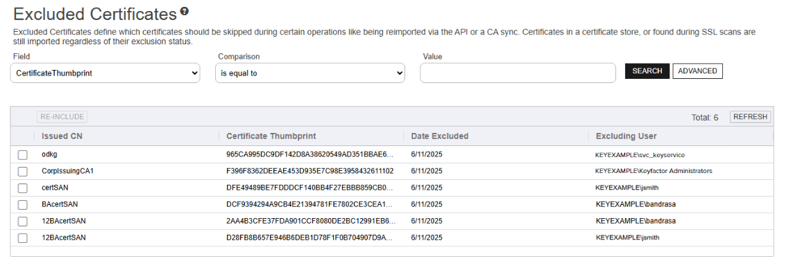 Excluded Certificates are certificates which have been deleted from the database and excluded from all Keyfactor Command functionality. These certificates will be skipped during a CA