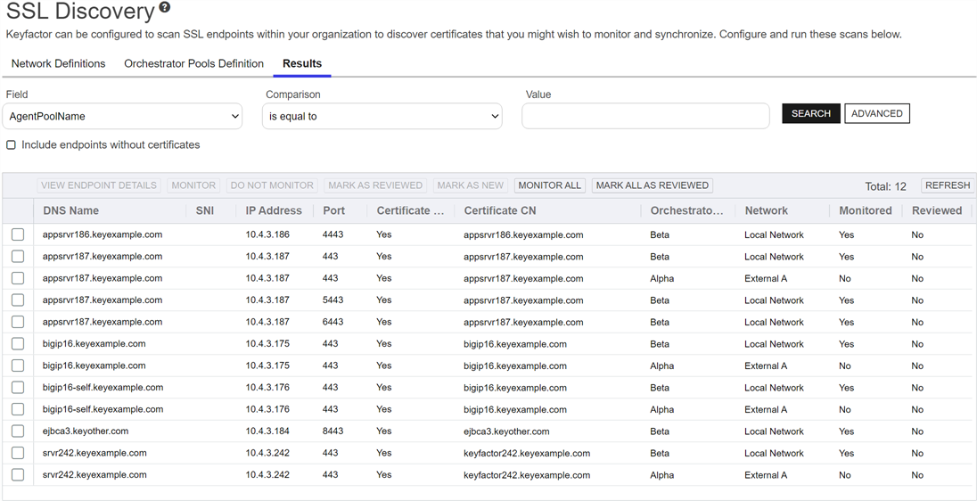 Whether the discovered endpoint is configured for monitoring (true/false). If the Automatically monitor endpoints found during discovery option is enabled in the network definition, the orchestrator will, upon initial discovery, monitor the discovered certificate. You can change the monitoring status of a discovered endpoint in the results grid.