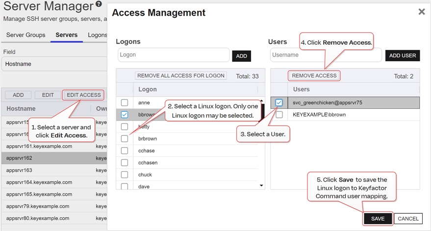 Tip: Clicking Remove All Access for Logon on the Logons side of the page removes all Linux logon to Keyfactor user mappings for the selected logon on the selected server with one click without the need to select the users on the Users side of the page.This option does not delete the logon from any servers (see Add or Edit Access for an SSH Logon).