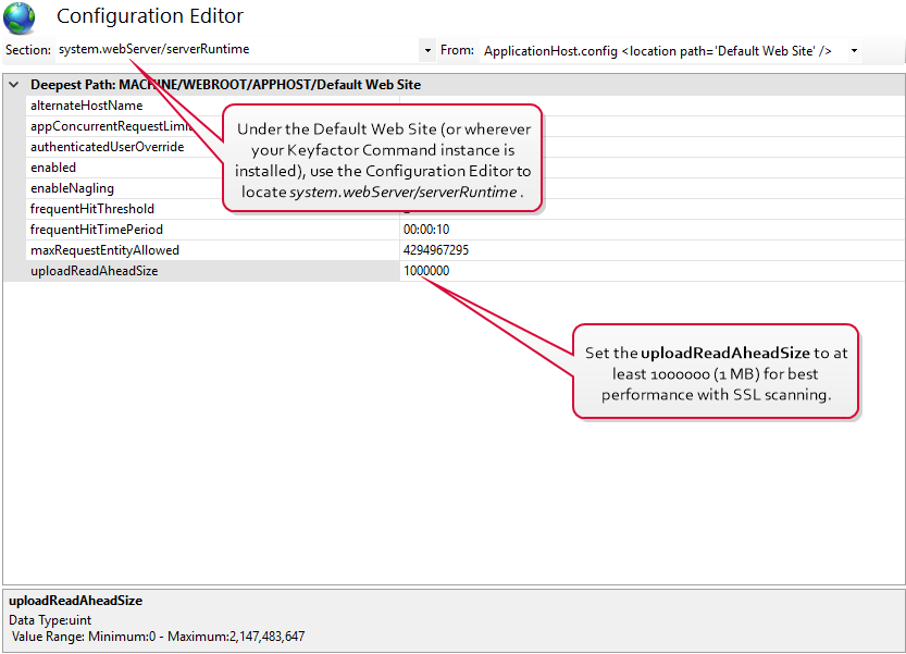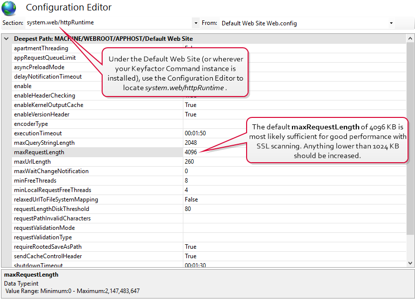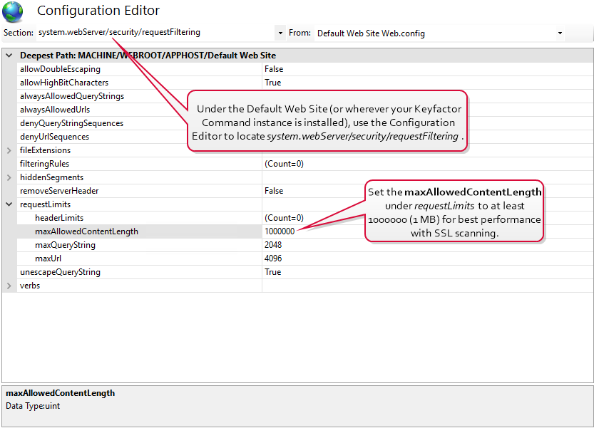 You may want to make modifications to the IIS maximum request size settings on your Keyfactor Command server to allow it to accept larger incoming pieces of content to streamline SSL scanning. You can do this using the configuration editor built into the IIS management console. Make the setting changes at the Default Web Site level (or other web site, if you installed your Keyfactor Command in an alternate web site). There are three settings to change: