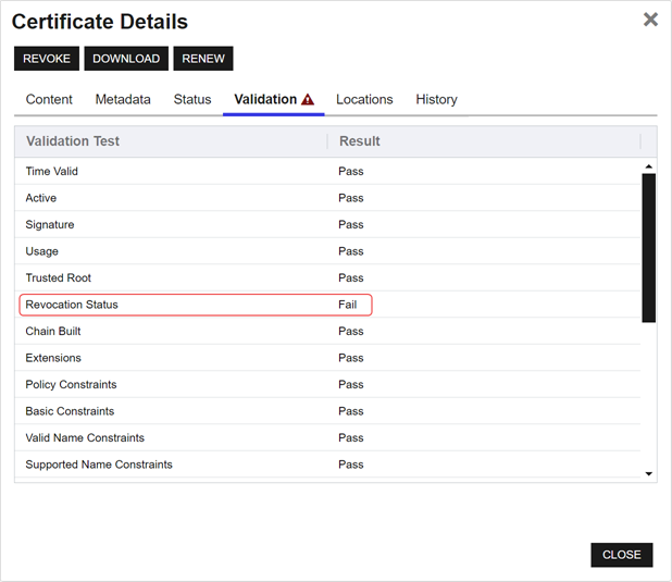 If you see Revocation Status in a fail state but CRL Online is in a pass state, this can indicate that the CRL is accessible but expired, that the CRL is not fully configured, or that the Authority Information Access