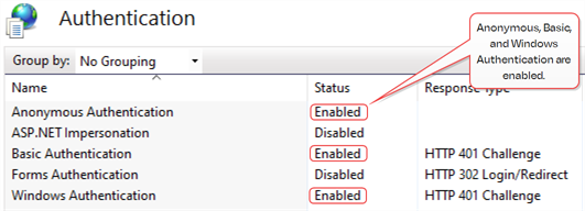 If authentication is not working as expected, it can be helpful to review whether the authentication configuration in IIS is correct for the identity provider you have configured. The correct IIS authentication configurations are: