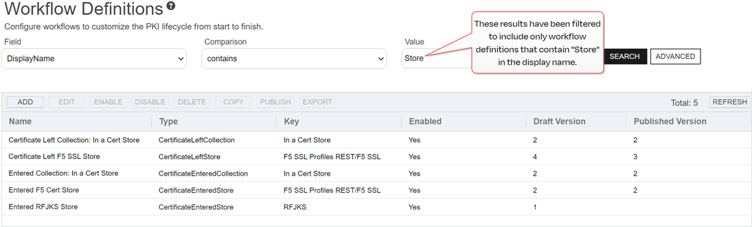 The certificate search function allows you to query the Keyfactor Command database for certificates from any available source based on any criteria of the certificates and save the results as a collection that will be availble in other places in the Management Portal (e.g. expiration alerts and certain reports).) of the workflow definition. Keyfactor Command reference IDs can be determined using Keyfactor API