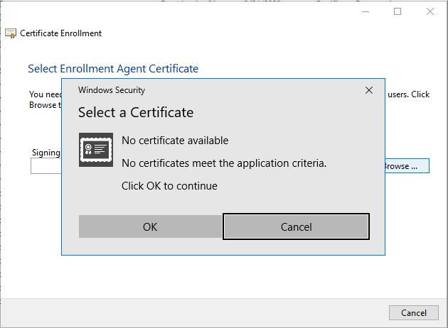 Figure 720: No Certificate Available During Enroll on Behalf of