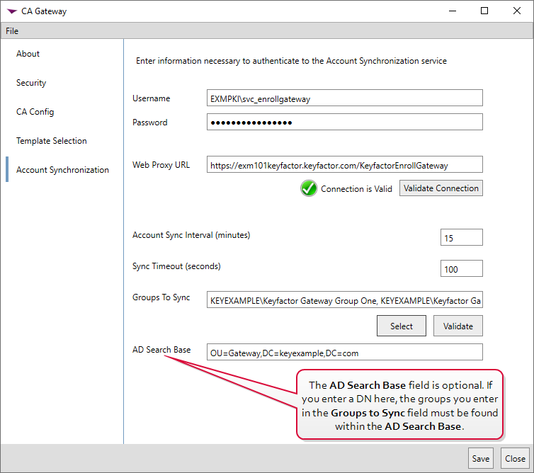 A distinguished name (DN) uniquely identifies an entry in an LDAP/X.500 directory by specifying a sequence of relative distinguished names (attribute=value pairs) from the entry up to the directory root. It’s written as a comma-separated string—for example: cn=Alice,ou=People,dc=keyexample,dc=com—with the specific attributes defined by the directory’s schema. syntax (e.g., ou=Groups,dc=keyexample,dc=com). This setting is optional. If this field is left blank, the entire Active Directory tree will be searched for the groups entered in the Groups To Sync field.Note: Although the AD Search Base option limits the search to groups found within the specified location, all users in these groups, regardless of their location in Active Directory, will be synchronized.