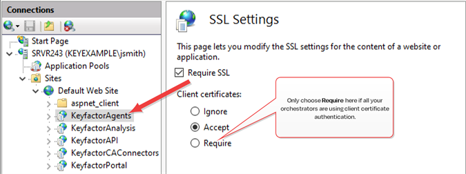 Tip:  If your KeyfactorAgents endpoint is running on a standalone server with no other Keyfactor roles, you may also configure your server to Require or Accept for Client certificates at the Default Web Site level. It is good security practice to check the Require SSL box. If your KeyfactorAgents endpoint is running on a server with other Keyfactor roles, you do not need to accept client certificates at this level and should not require them at this level.