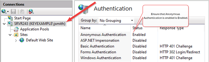 1. In the IIS Management console, highlight the server name on the left and open Authentication. Make sure Anonymous Authentication is the only enabled method.