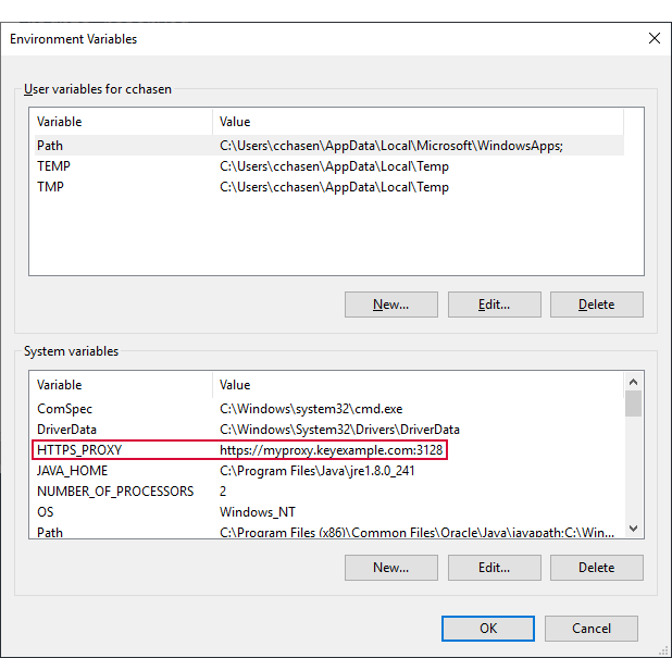 Note:  If you've configured an HTTPS_PROXY environment variable because you're using a secure channel to communicate with Keyfactor Command (SSLClosed TLS (Transport Layer Security) and its predecessor SSL (Secure Sockets Layer) are protocols for establishing authenticated and encrypted links between networked computers.), you will most likely also need an HTTP_PROXY environment variable for the orchestrator to do revocation status (CRLClosed A Certificate Revocation List (CRL) is a list of digital certificates that have been revoked by the issuing Certificate Authority (CA) before their scheduled expiration date and should no longer be trusted.) checking unless you disable revocation status checking.