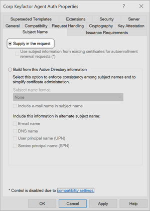 To acquire a certificate for use by the Universal Orchestrator using a Microsoft CAClosed A certificate authority (CA) is an entity that issues digital certificates. Within Keyfactor Command, a CA may be a Microsoft CA or a Keyfactor gateway to a cloud-based or remote CA., first create a templateClosed A certificate template defines the policies and rules that a CA uses when a request for a certificate is received. using the appropriate configurations as described above and make it available for enrollment on the CA from which you will request the certificate. If you plan to enroll for the certificate through Keyfactor Command, you will also need to enable the template for enrollment in Keyfactor Command. The account requesting the certificate will need enroll permissions on the CA, on the template, and, if applicable, in Keyfactor Command.