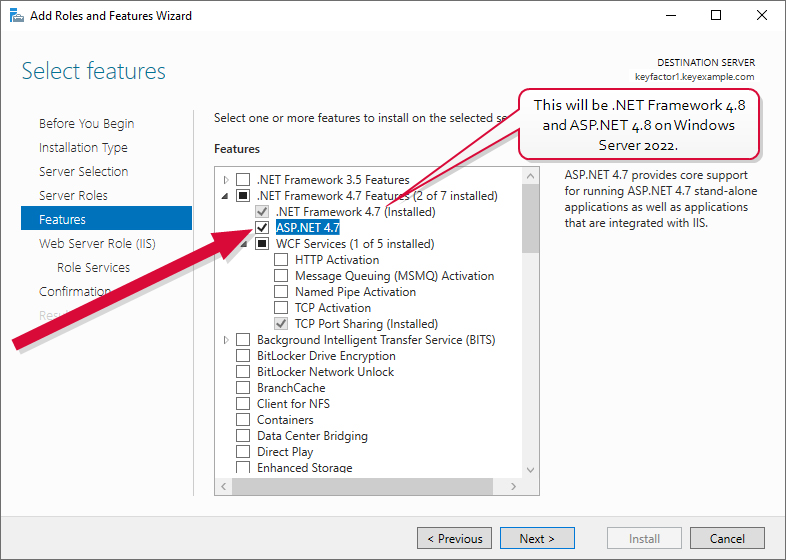 Internet Information Services (IIS), the ASP.NET Core Hosting Bundle version 8.0 (x64), and .NET Framework 4.7.2 or greater must be installed on the Keyfactor Command server(s) prior to installation of the Keyfactor Command software.