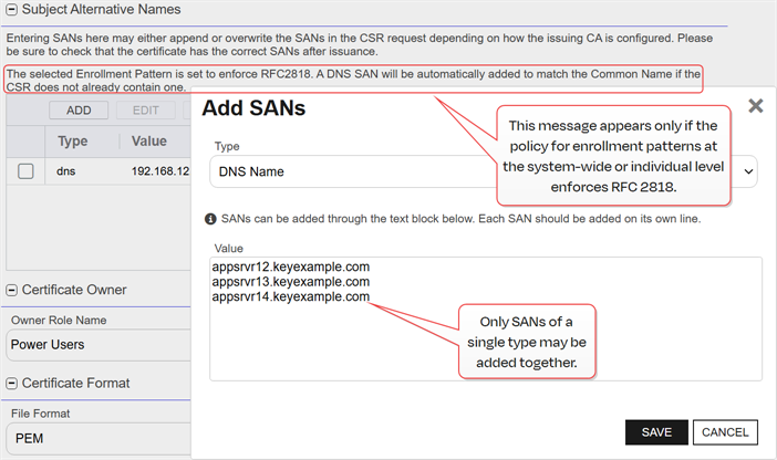Note:  SANs that are submitted outside the CSR may be ignored, appended to, or overwrite the SANs in the CSR depending on the issuing CA’s configuration. Always verify the issued certificate’s SANs after enrollment. Any SANs added automatically for RFC 2818 compliance (see System-Wide: Policies Tab) will still be included alongside manually supplied values.