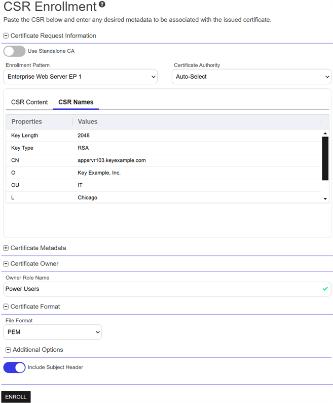 2. On the CSR Enrollment page, in the Certificate Request Information section, enable Use Standalone CA to enroll from a standalone CA, if applicable. This toggle appears only if you have a standalone CA configured for enrollment. Enabling this option will disable the Enrollment Pattern dropdown. Enrollment patterns are not used for standalone CA enrollments.