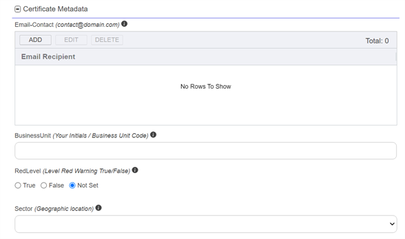 8. In the Certificate Metadata section of the page, populate any defined certificate metadataClosed Metadata provides information about a piece of data. It is used to summarize basic information about data, which can make working with the data easier. In Keyfactor Command, the certificate metadata feature allows you to create custom metadata fields that allow you to tag certificates with tracking information about certificates. fields (see Certificate Metadata, Edit, and Adding or Modifying an Enrollment Pattern) as appropriate. These fields may be required or optional depending on your metadata configuration. Required fields will be marked with *Required next to the field label. Any completed values will be associated with the certificate once it has been synchronized with Keyfactor Command. The order in which the metadata fields appear can be changed (see Sorting Metadata Fields).