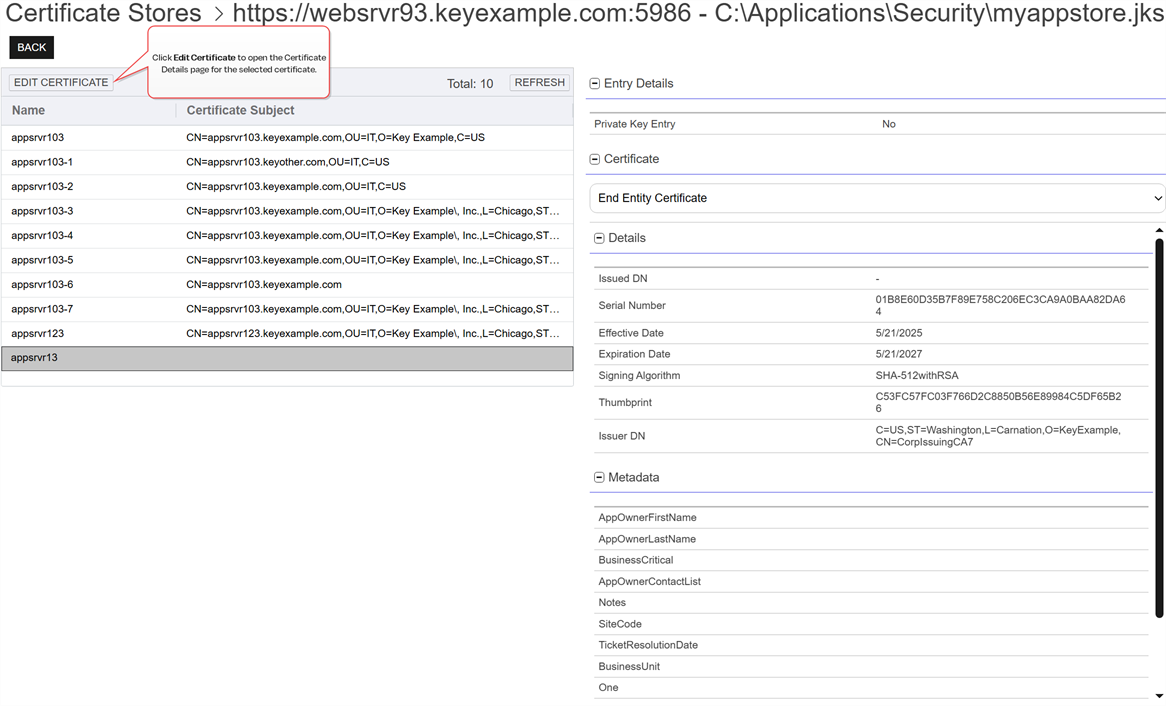 - On the Certificate Stores tab, highlight the row in the certificate store grid of the store for which to view certificate store details and click View at the top of the grid or right-click the store location in the grid and choose View from the right-click menu.